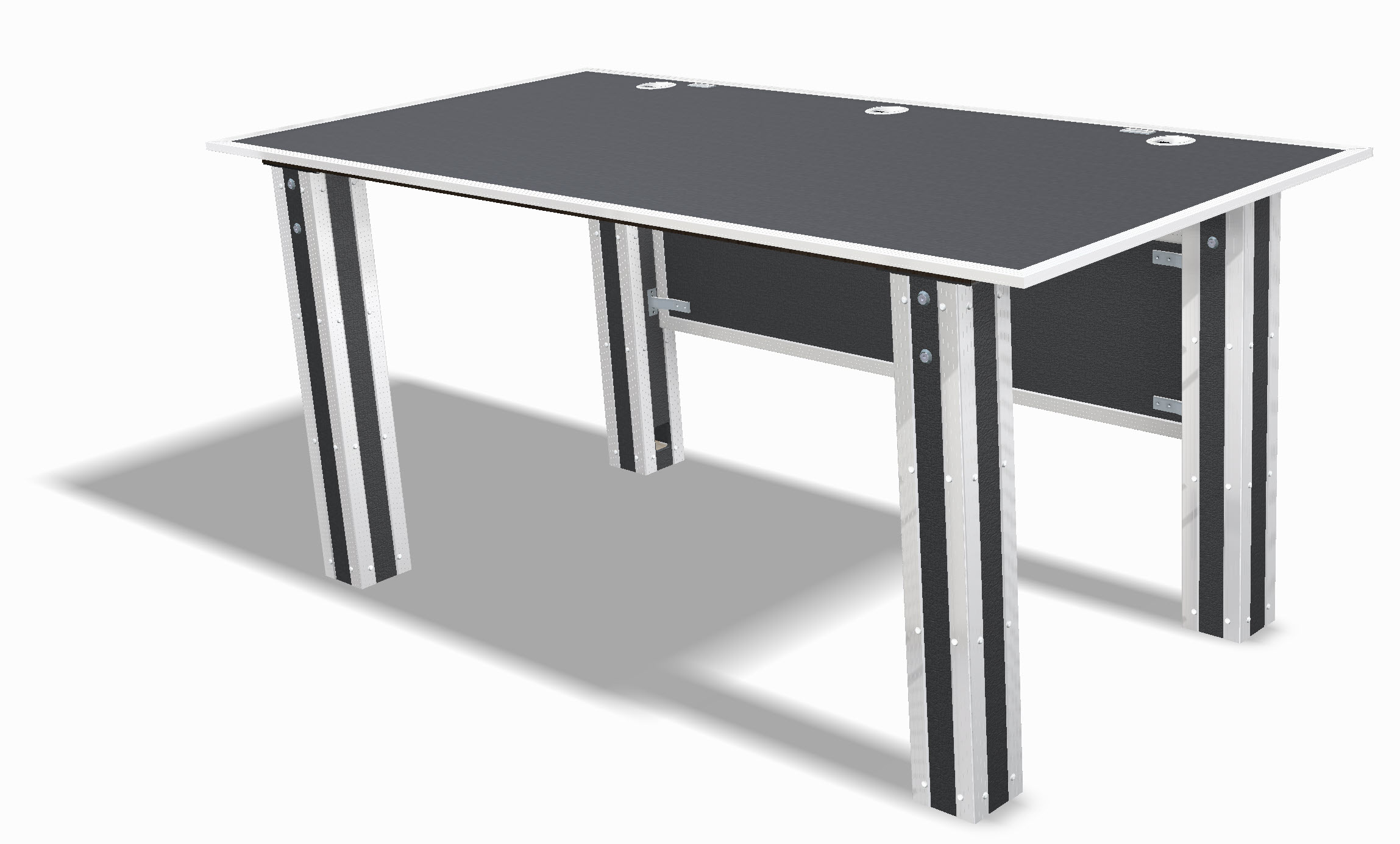 Auf Wunsch kann der Tisch mit integrierten Kabeldurchführungen, individuellen Maßen oder einer Beinblende gefertigt werden – für eine geschlossene, elegante Optik und zusätzlichen Sichtschutz im unteren Bereich.