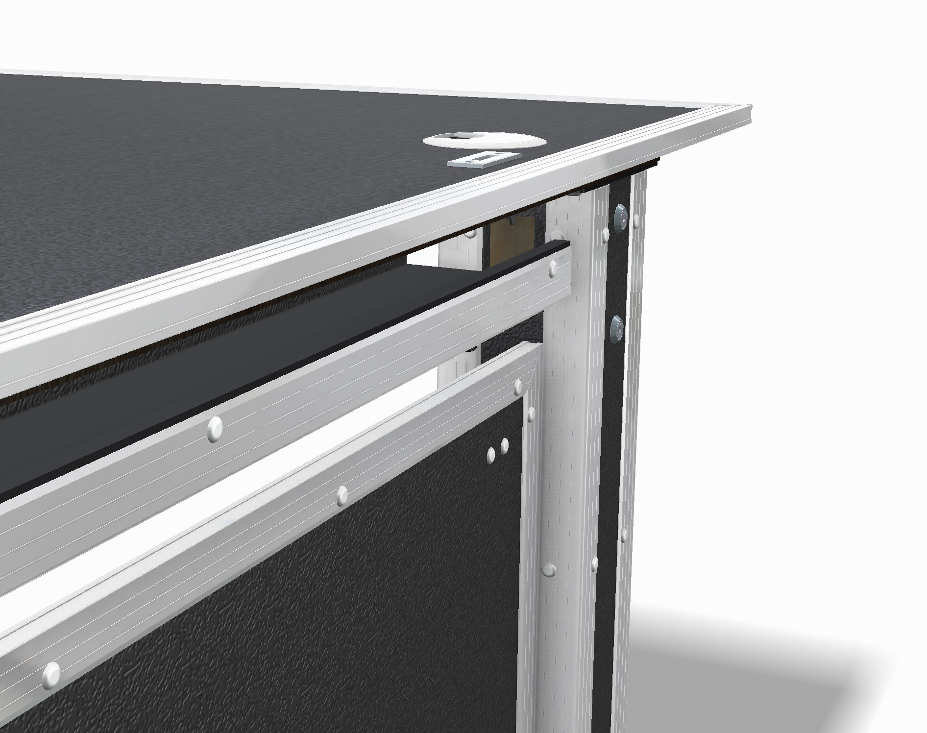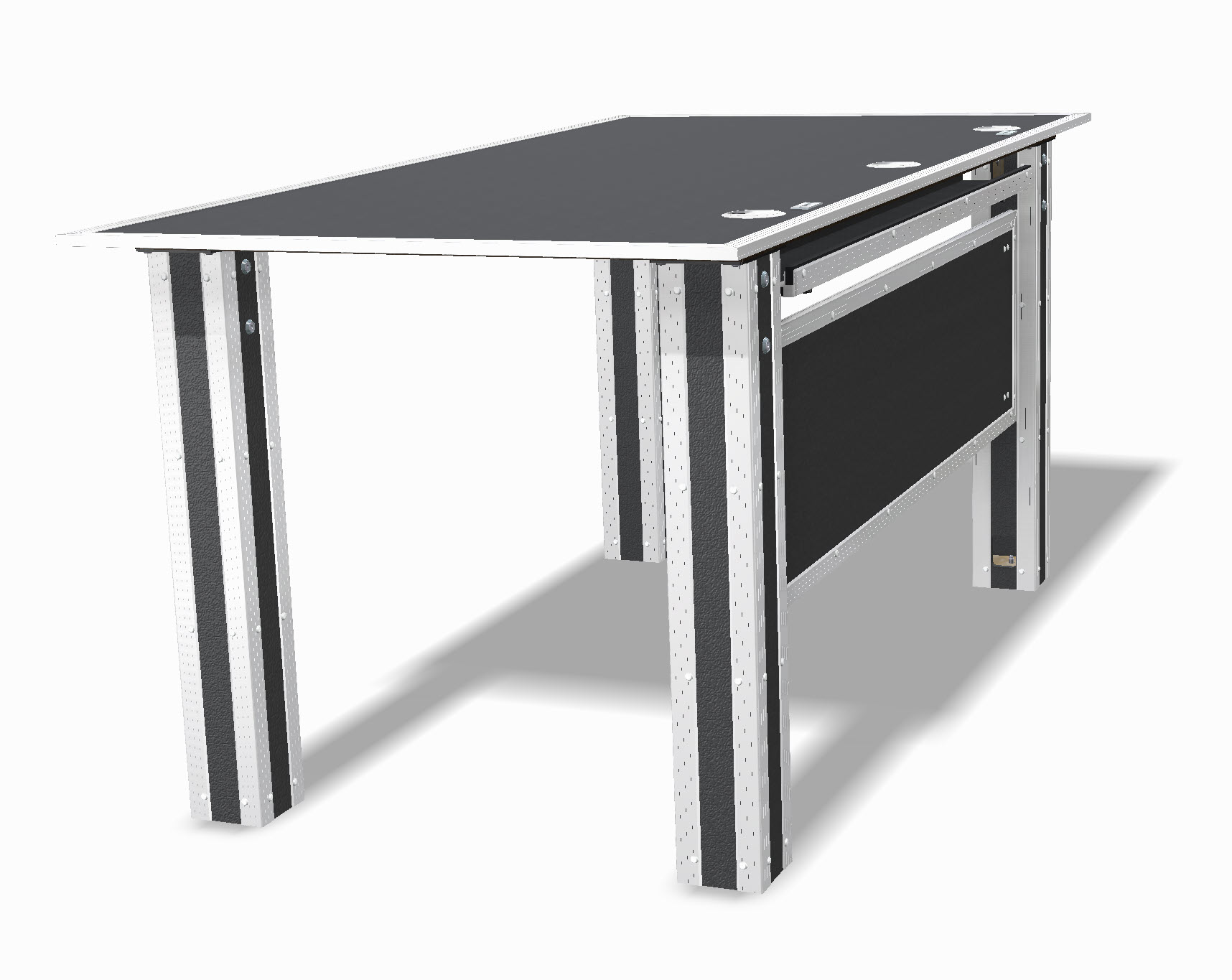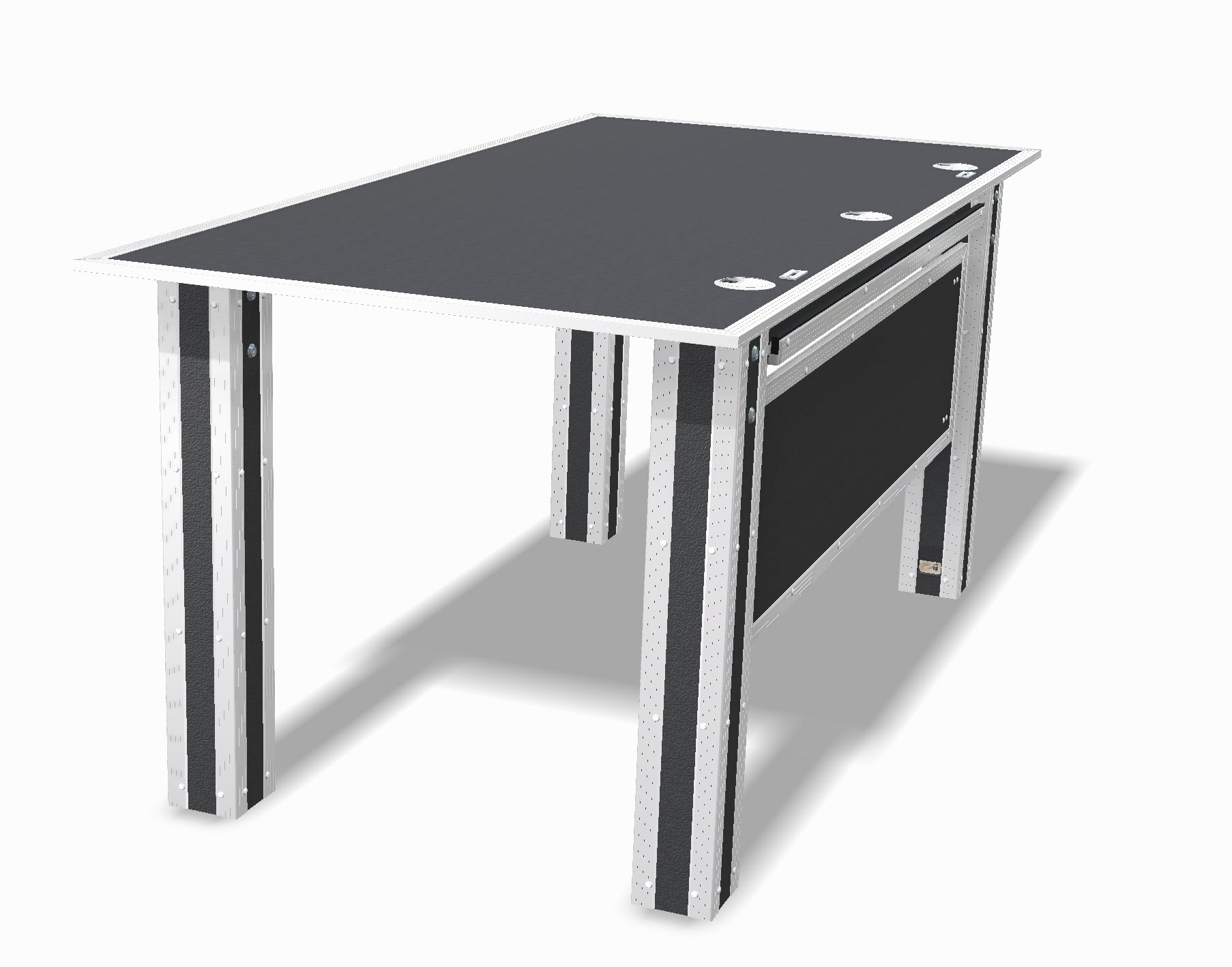 Der Flightcase Bürotisch vereint modernes Industriedesign mit höchster Funktionalität. Gefertigt aus originalen Flightcase-Materialien – robustes Birkenmultiplex, eloxierte Aluminiumprofile und verstärkte Metallecken – überzeugt er durch Stabilität, Langlebigkeit und den unverwechselbaren SwissCase-Look.