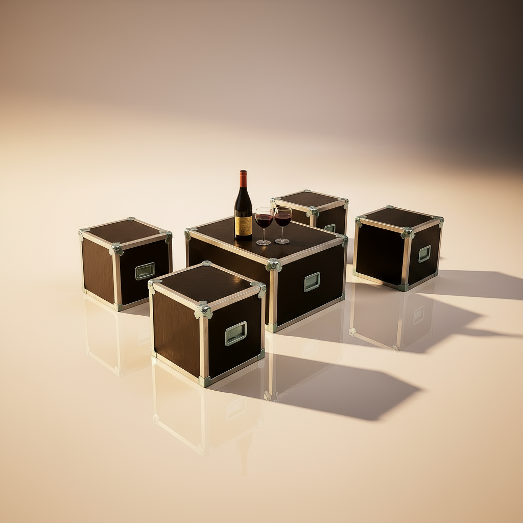 Die Flightcase Sitzgruppe verbindet Industrial Style mit modernem Design. Gefertigt aus originalen Flightcase-Materialien – Birkenmultiplex, Aluminiumprofile und Metallecken – ist sie extrem robust, langlebig und authentisch.