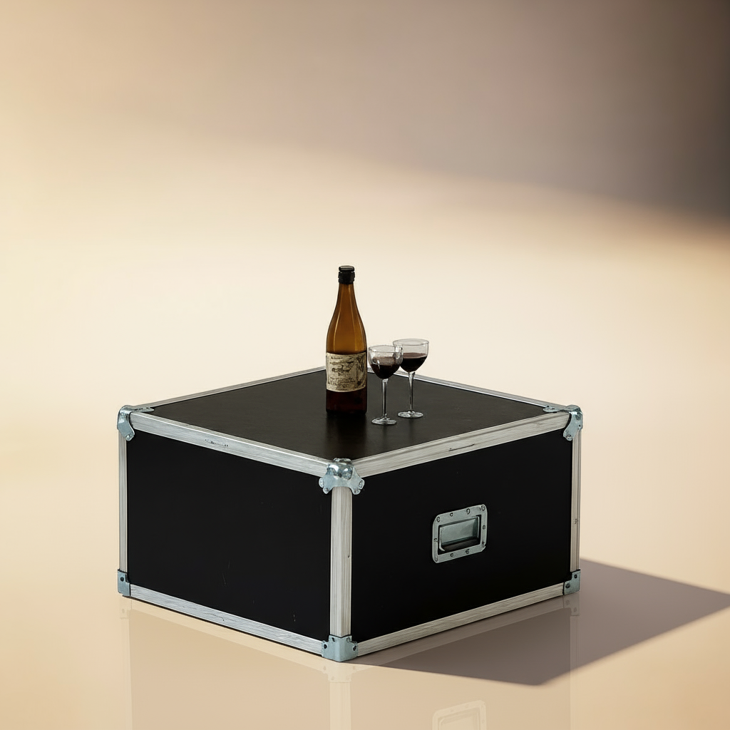 Der Flightcase Tisch verbindet Industrial Style mit modernem Design. Gefertigt aus originalen Flightcase-Materialien – Birkenmultiplex, Aluminiumprofile und Metallecken – ist er extrem robust, langlebig und authentisch.